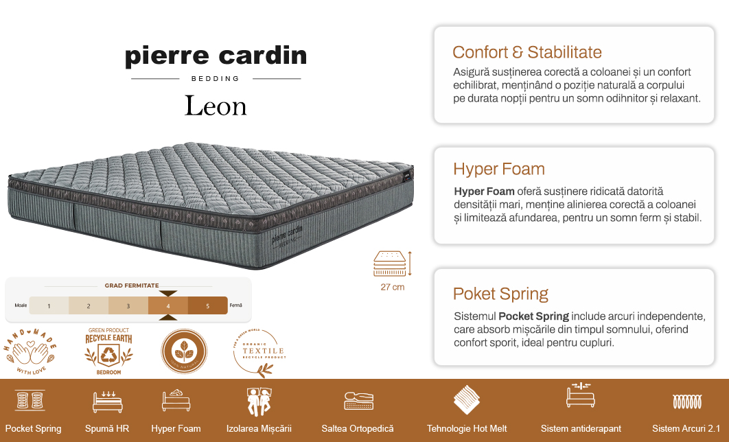 Patul tapițat Leon, realizat sub semnătura Pierre Cardin, propune o estetică modernă definită prin linii clare și o cromatică echilibrată, în tonuri d..